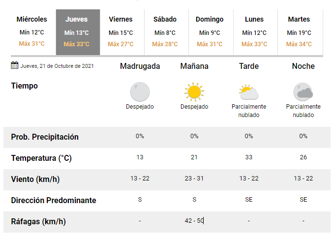 El día comenzará con cielo despejado pero en la tarde-noche estará nublando, ya que el viento del sur azotará el ambiente con ráfagas que alcanzarán velocidades entre 42 y 50 km/h.