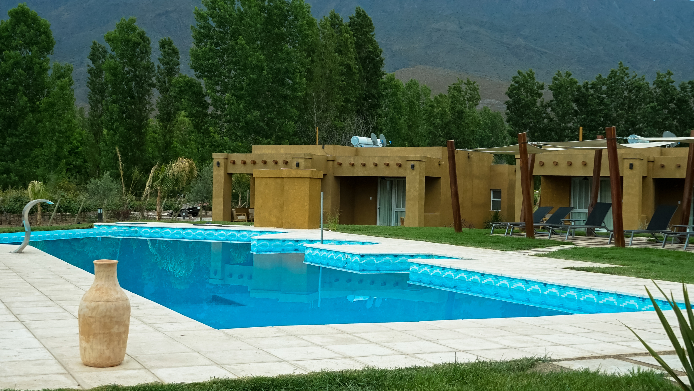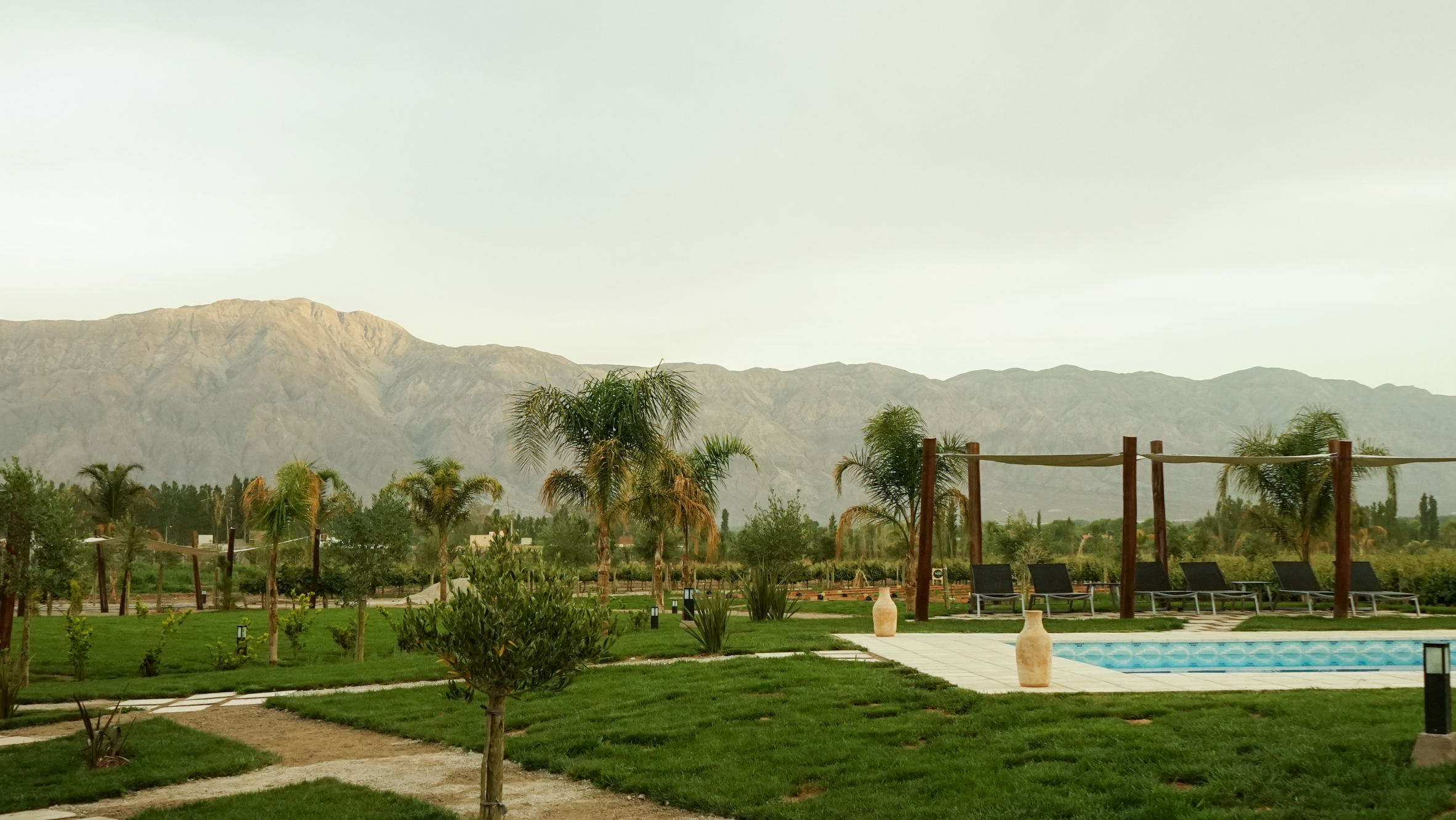 Es muy sencillo encontrarlo en el mapa zondino ya que apenas uno llega a calle Las Moras se dirige hasta la avenida Sarmiento para girar hacia el Oeste, y a los pocos kilómetros – antes de llegar a Bodega Sierras Azules-, a mano izquierda, se observa esta construcción en tonalidades amarillo ocres ensamblada perfectamente con el paisaje. Desde el ingreso ya se puede percibir que allí hay cosas que sorprenderán y esta percepción no falla. Una recepción sencilla y a la vez con detalles de lujo en colores cálidos, es la segunda aproximación a este nuevo hotel. De inmediato se encuentra el restaurante que deja ver el inmenso parque y los cordones montañosos.
