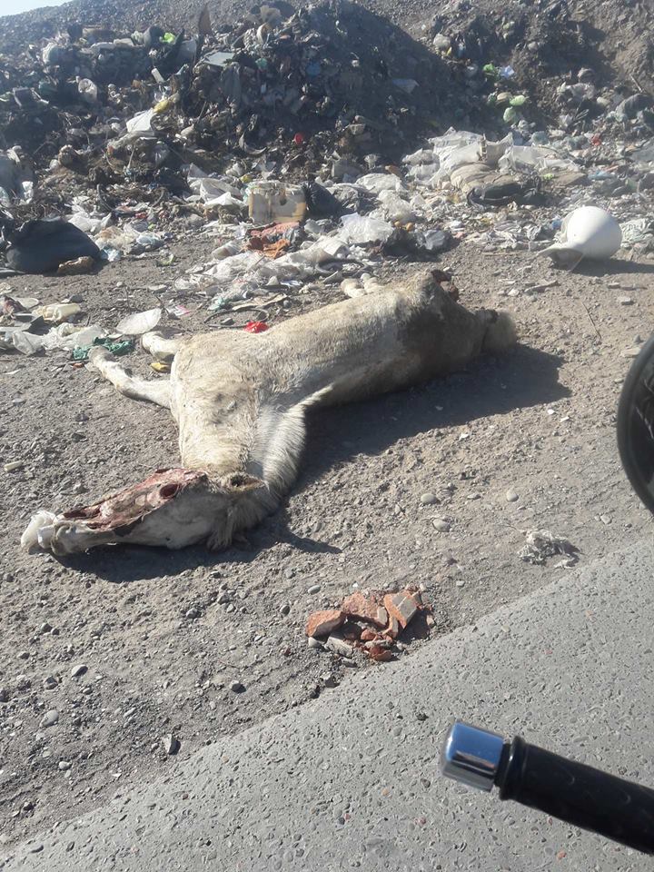 Un lector envió una imagen y el siguiente comentario: "Esto pasa cerca del ingreso del Parque Industrial de Chimbas. Animales muertos, incluso un caballo, y mucha pero mucha mugre".