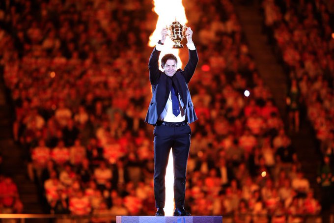Luego llegó la presentación de los países participantes, por orden alfabético y empezando por Argentina pero con Japón cerrando la lista en el marco de la primera gran ovación. La segunda fue cuando, después de recordar a los campeones desde la primera edición mundialista de 1987 (en el momento de Francia 2007 se vio un primerísimo plano de Agustín Pichot celebrando la victoria de aquel debut de Los Pumas ante los locales), "desde las entrañas" del monte Fuji apareció la preciada y dorada copa William Webb Ellis que recuerda al creador del rugby. Quien la levantó y la mostró al mundo fue el único hombre que la pudo sostener dos veces sobre sus hombros: el neocelandés Richie McCaw, capitán de los All Blacks campeones del mundo en 2011 y 2015.