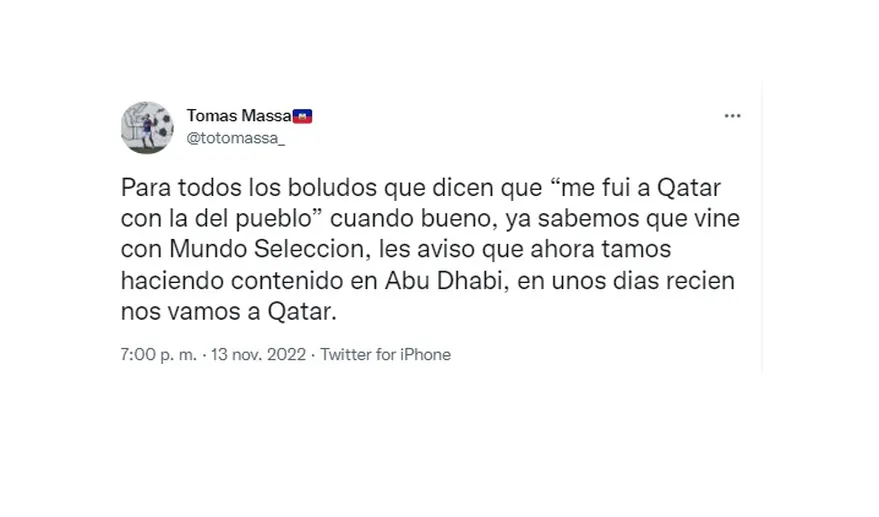No obstante, “Toto” Massa, que suele ser muy activo en Twitter, utilizó su cuenta para contestar. “Para todos los boludos que dicen que ‘me fui a Qatar con la del pueblo’ cuando, bueno, ya sabemos que vine con Mundo Selección, les aviso que ahora estamos haciendo contenido en Abu Dhabi, en unos días recién nos vamos a Qatar”, aclaró el joven fanático de Tigre.