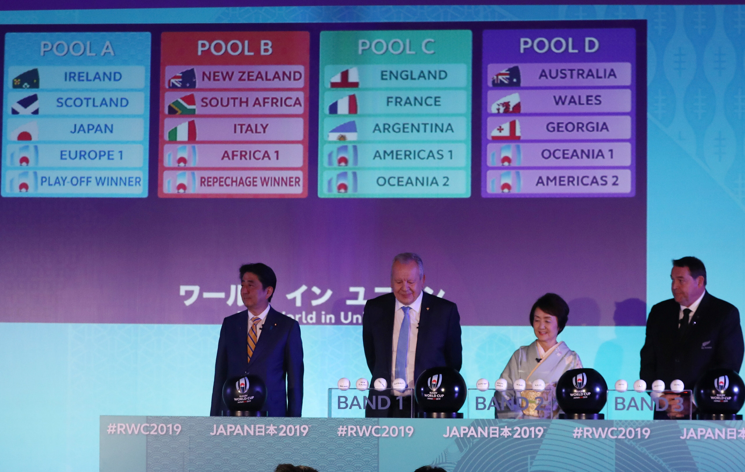El sorteo. Argentina, por estar en la 9na posición en el ránking, tuvo que integrar el tercer copón durante el sorteo de grupos del Rugby World Cup 2019, que se realizó en Kyoto.