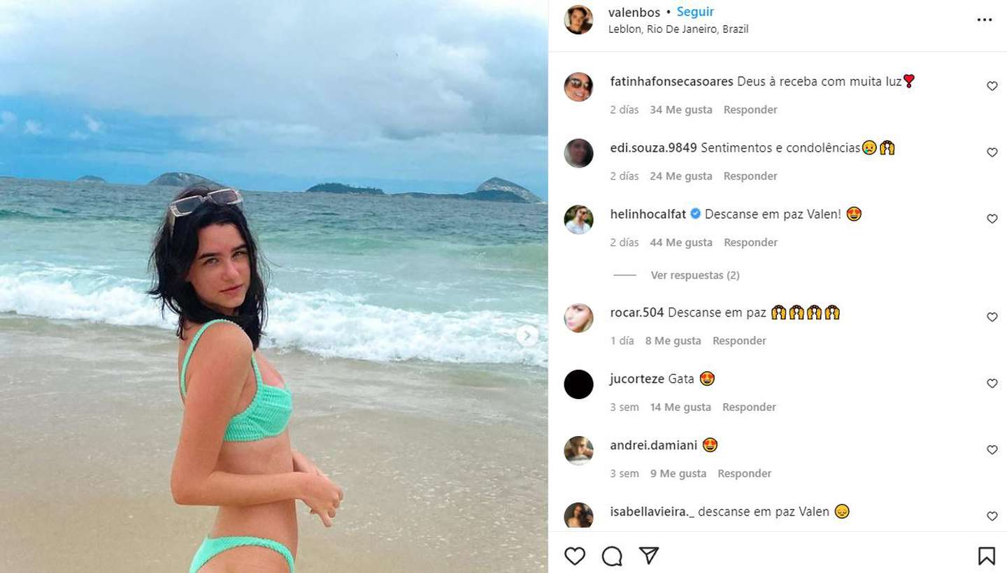 Valentina Boscardin trabajó para la agencia Ford Models Brasil São Paulo y participó en giras internacionales. Su último posteo en su Instagram (@valenbos) fue el 19 de diciembre. En las imágenes se la puede ver sonriente y mirando a cámara, con la playa de Leblon (Río de Janeiro) a sus espaldas. Tras su muerte, la publicación se llenó de mensajes de sus seguidores. “Descansa en paz”, fue el comentario que más se repitió.