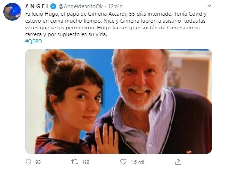 "Falleció Hugo, el papá de Gimena Accardi, 55 días internado. Tenía Covid y estuvo en coma mucho tiempo. Nico y Gimena fueron a asistirlo todas las veces que se los permitieron. Hugo fue un gran sostén de Gimena en su carrera y por supuesto en su vida", informó Ángel de Brito desde su cuenta.
