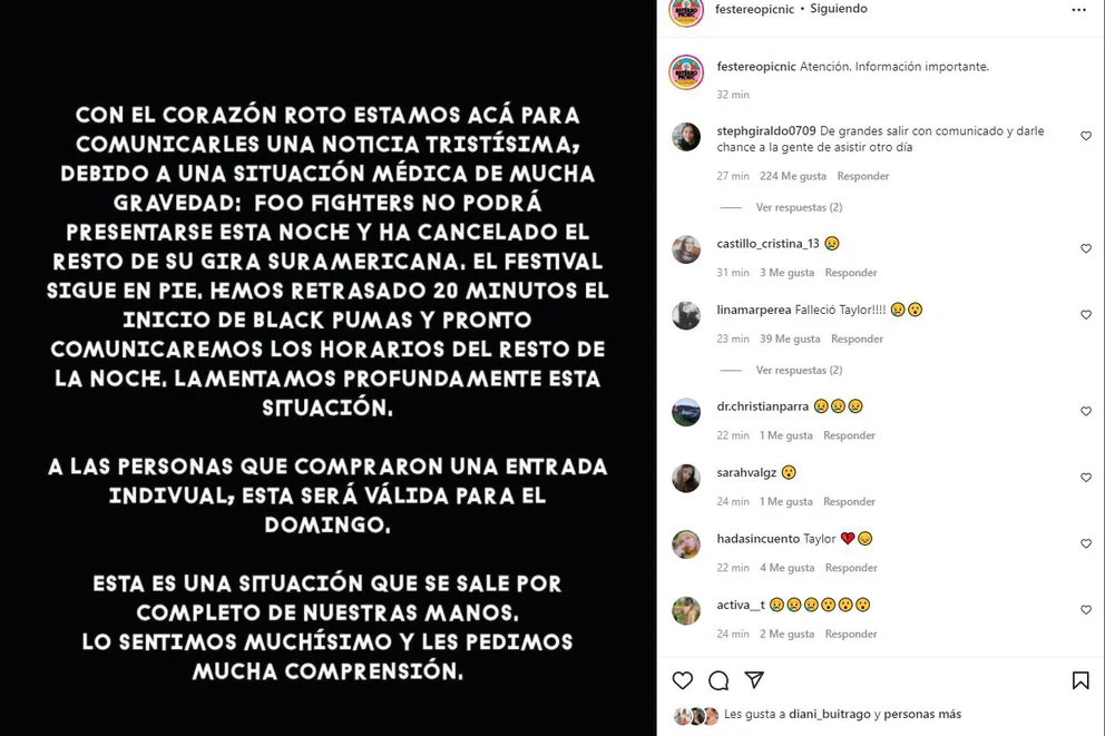 Antes de la presentación de la banda en el Festival Estereo Picnic, los organizadores anunciaron a los asistentes la cancelación de la presentación de la banda con el siguiente mensaje: