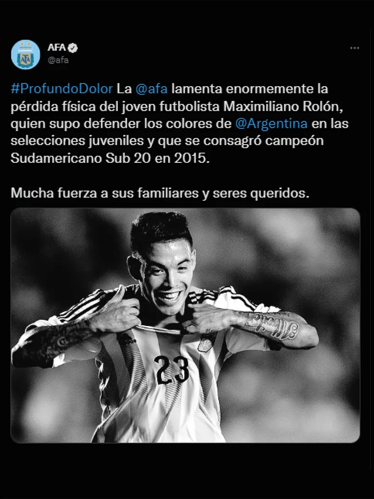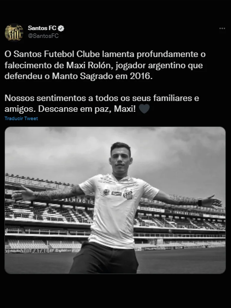 “Santos Futebol Clube lamenta profundamente el fallecimiento de Maxi Rolón, jugador argentino que defendió el Manto Sagrado en 2016. Nuestras condolencias a toda su familia y amigos. ¡Descansa en paz Maxi!”, escribió el Santos de Brasil en sus redes. “#ProfundoDolor La AFA lamenta enormemente la pérdida física del joven futbolista Maximiliano Rolón, quien supo defender los colores de Argentina en las selecciones juveniles y que se consagró campeón Sudamericano Sub 20 en 2015. Mucha fuerza a sus familiares y seres queridos”, firmó la entidad que regula el fútbol argentino.