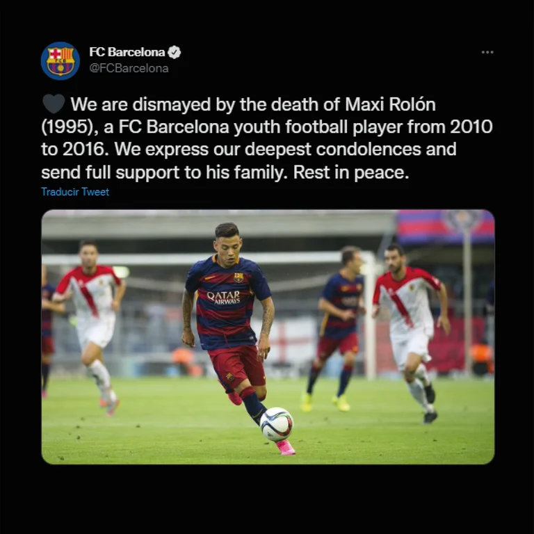 Maxi, de 27 años, había saltado a la fama hace casi una década atrás cuando desembarcó en La Masía del Barcelona. Si bien no llegó a tener minutos en el primer equipo, sí militó dos temporadas en el Barça B y fue clave en la obtención de la primera UEFA Youth League en 2014. El club publicó un comunicado tras enterarse de la noticia: “Consternados por la muerte de Maxi Rolón (1995), jugador del fútbol base del FC Barcelona entre 2010 y 2016. Expresamos nuestro más sentido pésame y todo el apoyo a su familia. Descanse en Paz”.