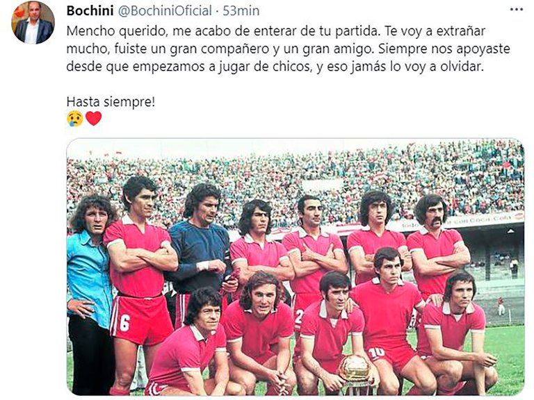 Otra personalidad reconocida del club que se mostró muy conmovida fue Ricardo Bochini. “Mencho querido, me acabo de enterar de tu partida. Te voy a extrañar mucho, fuiste un gran compañero y un gran amigo. Siempre nos apoyaste desde que empezamos a jugar de chicos, y eso jamás lo voy a olvidar. Hasta siempre!”, fueron las palabras del ídolo del Rojo, acompañando el texto con una foto de la formación campeona de la Intercontinental en 1973.