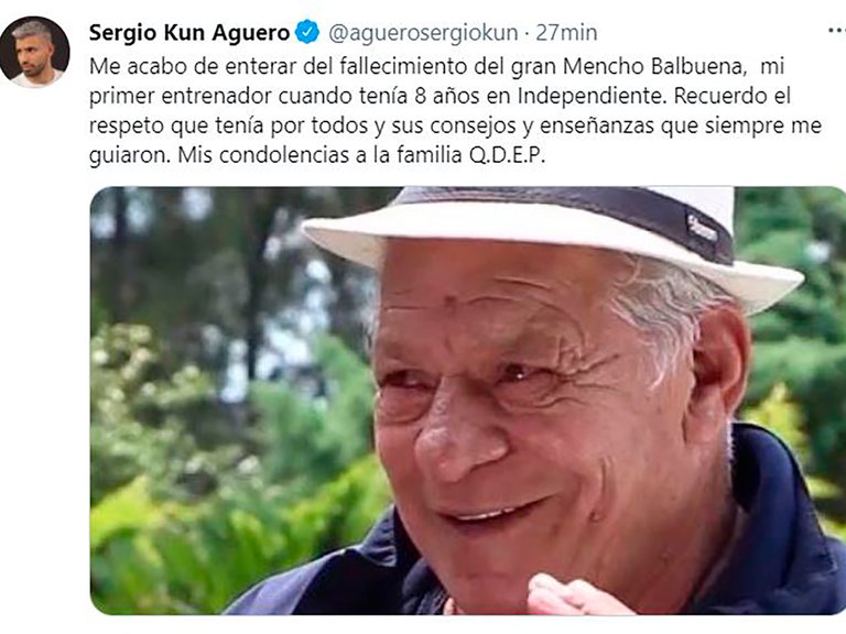 “Me acabo de enterar del fallecimiento del gran Mencho Balbuena, mi primer entrenador cuando tenía 8 años en Independiente. Recuerdo el respeto que tenía por todos y sus consejos y enseñanzas que siempre me guiaron. Mis condolencias a la familia Q.D.E.P”, escribió Sergio Agüero en sus redes sociales en memoria de uno de sus primeros mentores.