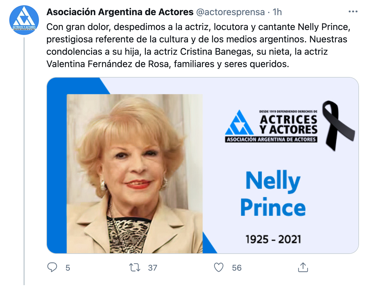 La noticia fue confirmada desde la Asociación Argentina de Actores que compartió un mensaje en su cuenta de Twitter: “Con gran dolor, despedimos a la actriz, locutora y cantante Nelly Prince, prestigiosa referente de la cultura y de los medios argentinos. Nuestras condolencias a su hija, la actriz Cristina Banegas, su nieta, la actriz Valentina Fernández de Rosa, familiares y seres queridos”.
