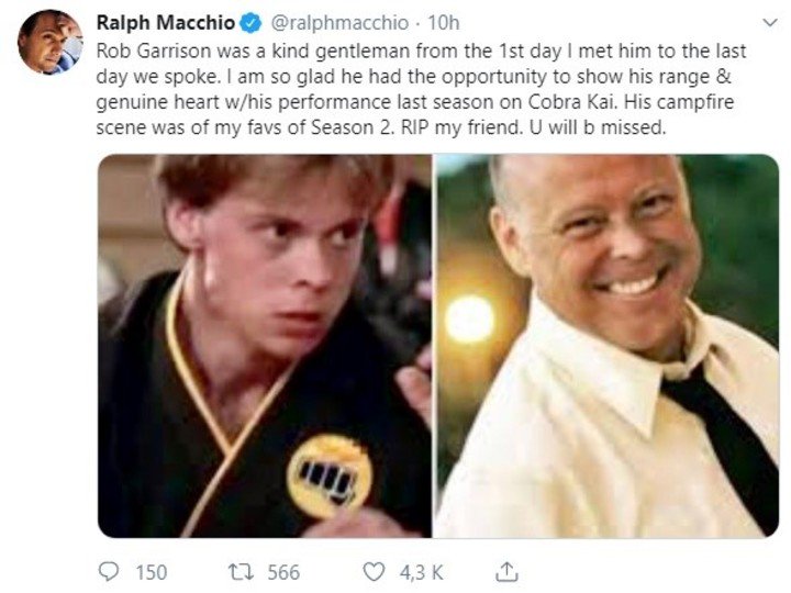 Ralph Maggio, protagonista de Karate Kid, dio sus condolencias a través de su cuenta de Twitter: "Rob Garrison fue un caballero amable desde el primer día que lo conocí hasta el último día que hablamos. Estoy muy contento de que haya tenido la oportunidad de mostrar su alcance y corazón genuino con su actuación la temporada pasada en Cobra Kai. Su escena de la fogata fue de mis favoritas de la temporada 2. Te vamos a extrañar", escribió.