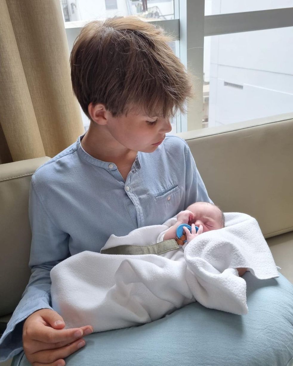 En las fotos que compartió la actriz se la puede ver con su hijito en brazos desde la camilla de la clínica, y también una fotografía de los dos hermanos juntos por primera vez. El hijo mayor de Angie es Benjamín y tiene 13 años.
