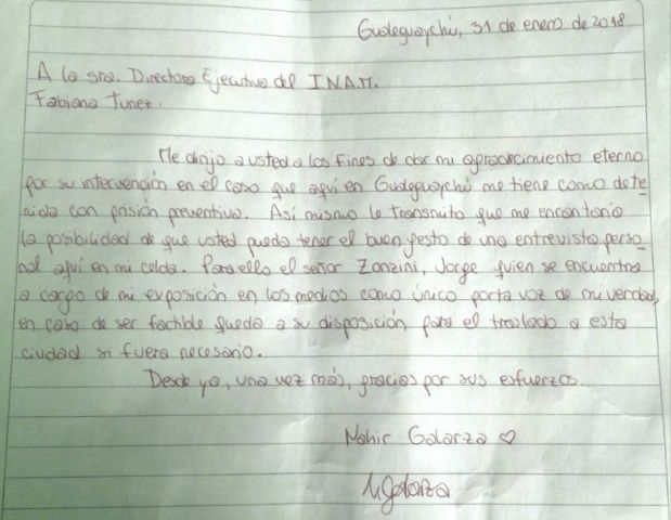 El vocero de Nahir Galarza Jorge Zonzini difundió una carta escrita por la joven desde la cárcel en la que le pidió ayuda al Instituto Nacional de las Mujeres (INAM) y le agradeció a ese organismo “por su intervención en el caso”.