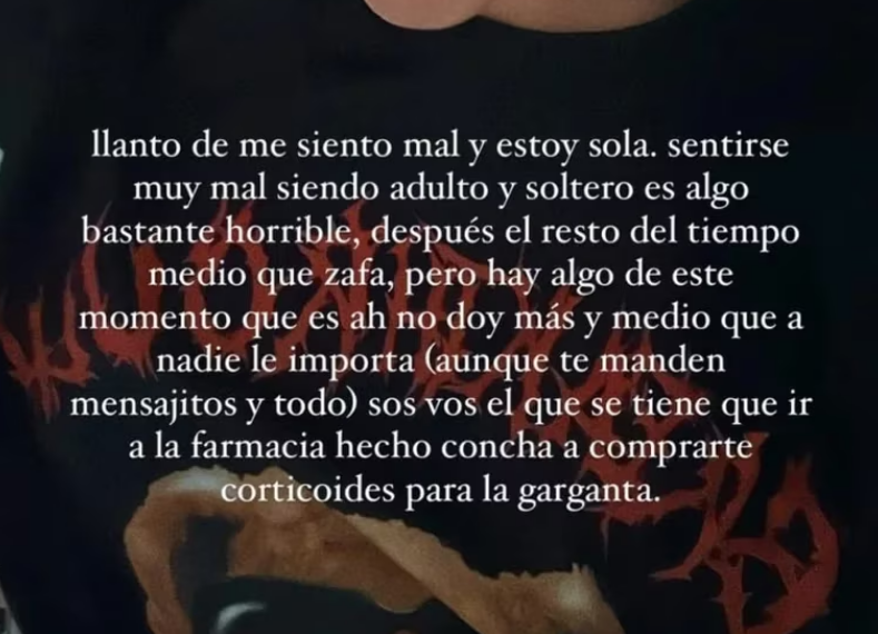 “Pero hay algo de este momento que es: ‘Ah, no doy más y medio que a nadie le importa (aunque te manden mensajitos y todo)’”, prosiguió en su descargo. “Sos vos el que se tiene que ir a la farmacia hecho concha a comprarte corticoides para la garganta”, se lamentó Nati por el hecho de, a pesar de contar con el apoyo de sus múltiples fanáticos, no tiene quien la ayude con las sencillas tareas domésticas de las que se tiene que ocupar, incluso estando enferma.