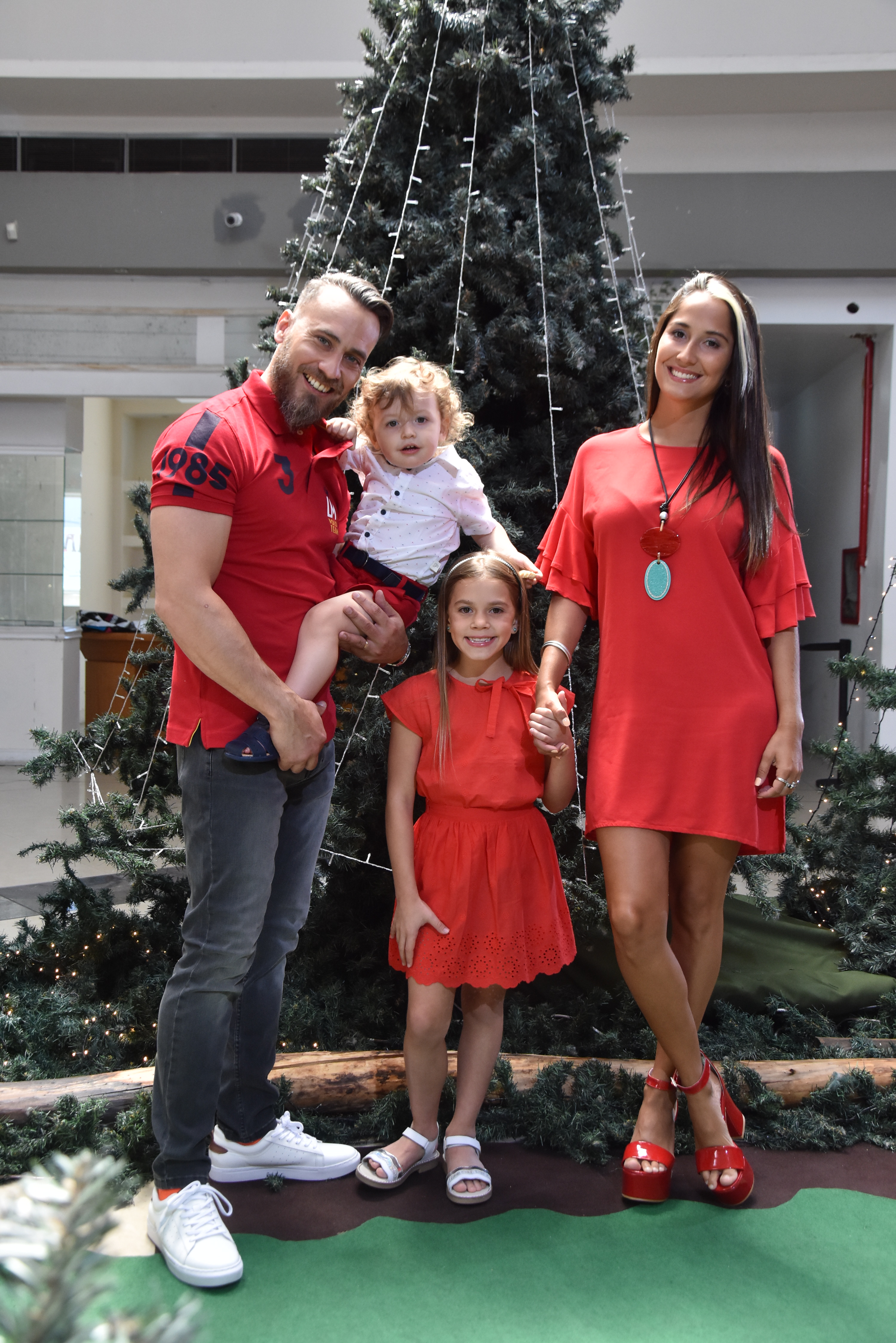 Rojo del amor y las buenas energías. Roberto con jeans ($5490), remera polo ($5490) y zapatillas de cuero ($6900) de La Martina. En sus brazos, Leoncito vestido por Chimento con camisa Pioppa ($2184) y bermuda con cinto de la marca Magdalena Espósito ($1930). Gala con conjunto de pollera y blusa de broderie de la marca Pioppa ($2395 y $2011) también de Chimento. Florencia con vestido con vuelos en las mangas ($3498) y como accesorio collar de Luna Garzón ($3489), todo de Silenzio. En los pies, sandalias taco palo con tira y talonera de charol ($2790 de Cloe).