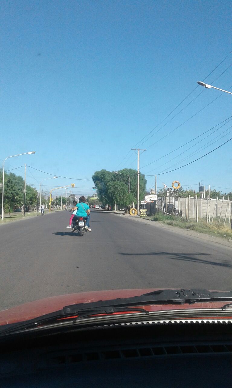Otra vez la inconsciencia en moto. Un lector envió una imagen tomada este miércoles en calle Doctor Ortega y Rivadavia, en el departamento Rawson, donde se observa una mujer en moto llevando a una nena en la falda.