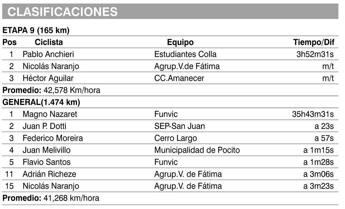 El uruguayo Anchieri ganó el noveno parcial. En la general no hubo cambios, Dotti se mantiene segundo de Magno Nazaret.