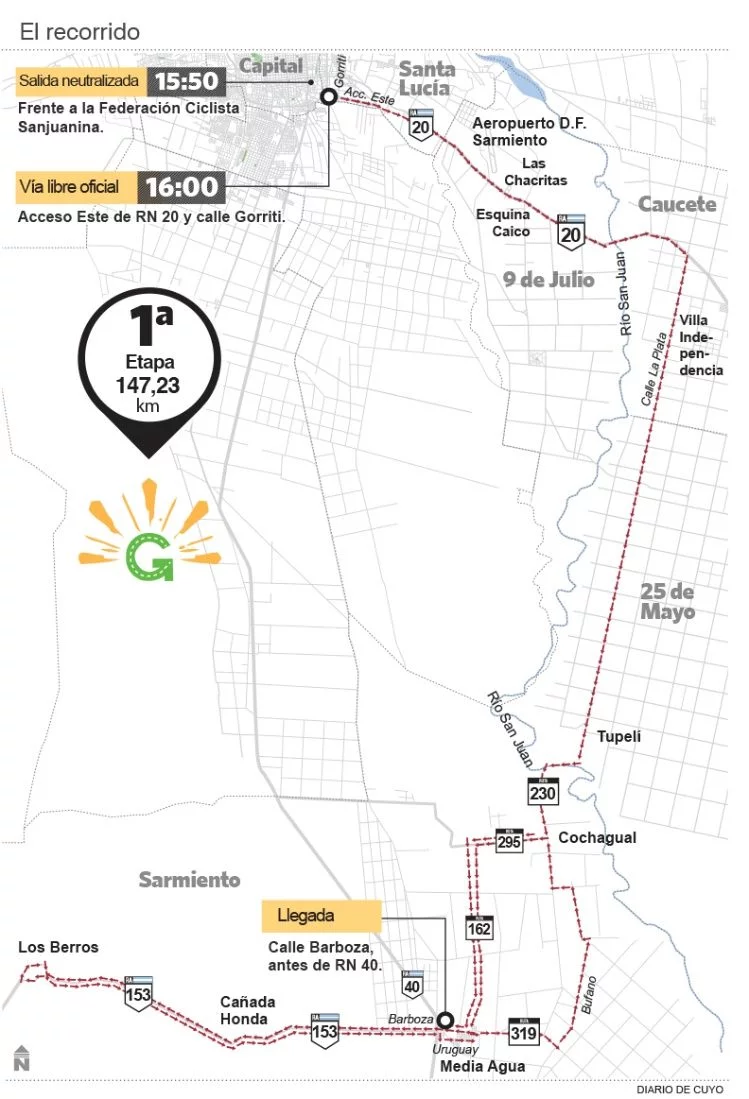 Este viernes a partir de las 16 horas comienza podría decirse la primera etapa oficial del Giro del Sol. En esta ocasión la etapa tendrá 147,2 kilómetros de recorrido y la cual tendrá inicio en Ruta 20 y calle Gorriti y se extenderá hasta Ruta 40, en la localidad de Media Agua.