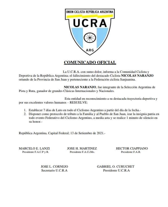 Siete días de luto en el ciclismo argentino