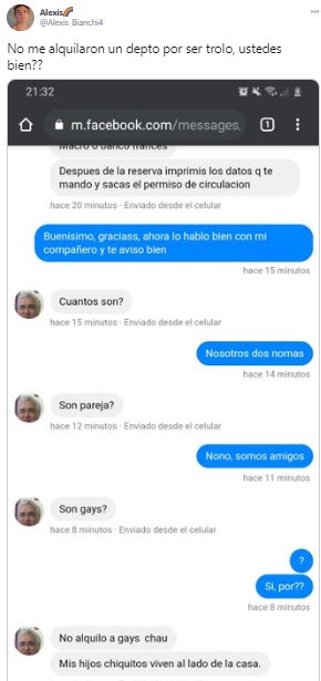 Durante la conversación con el responsable de la casa, le avisó que iría junto a uno de sus mejores amigos. Esto despertó la curiosidad de su interlocutor, quien preguntó: “¿Son gays?”, a lo cual Alexis lo confirmó y recibió la contundente respuesta: “No le alquilo a gays, chau”. Además, aseguró que esta prohibición se debía a que “mis hijos chiquitos viven al lado de la casa”.
