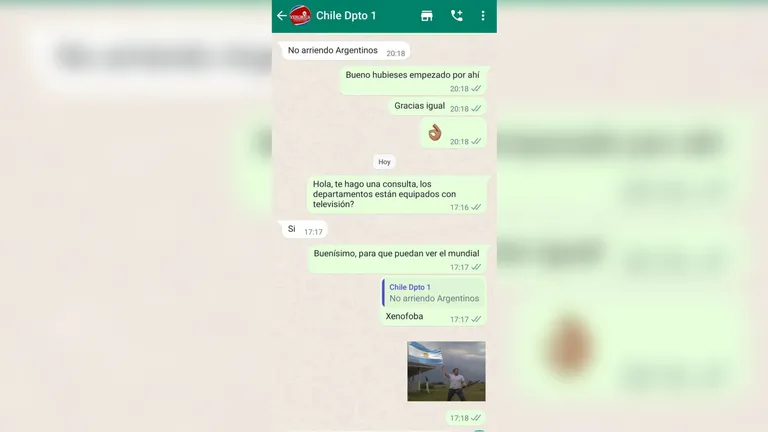 “No arriendo argentinos”, fue la respuesta que recibió Sofía por parte de la inmobiliaria chilena “Verónica Propiedades” a la que le consultó por dos departamentos que quería alquilar durante sus vacaciones en ese país. La reacción de la mujer, oriunda de la provincia de Mendoza, fue cordial y el contacto, a través de WhatsApp, terminó ahí. Sin embargo, el fracaso de la selección de fútbol de Chile en las Eliminatorias para el Mundial de Qatar le sirvió como excusa algunos días después para desquitarse de alguna manera de la inexplicable actitud de la empresa de alquilar.