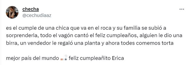 "Mejor país del mundo feliz cumpleañito Erica", escribió la twittera, quien compartió una foto de la rica torta. Internautas celebraron el hecho y recordaron situaciones similares que, en algún momento, también vivieron en el transporte público.