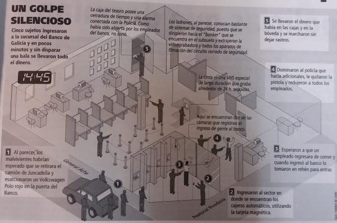 Todo ocurrió el 15 de enero del ’99, en esa calurosa siesta de verano y cuando ya no había un alma en el microcentro capitalino. Un grupo comando, por demás especializado en este tipo de hechos, esperó que se cerraran las puertas a los clientes, que el camión de Juncadella depositara el dinero y también que se abriera la bóveda, para luego ingresar a la sucursal del Banco Galicia ubicada en la esquina de General Acha y Rivadavia, en una de las entradas de la Peatonal.