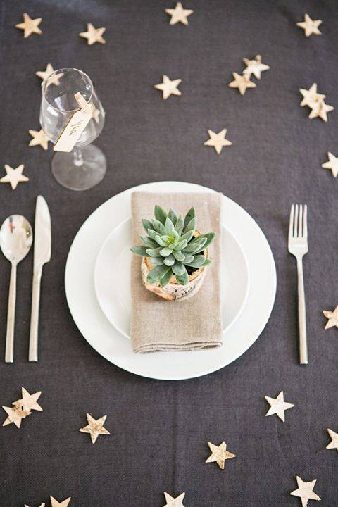 Esta idea de las estrellitas esparcidas sobre el mantel luce fantástica y es súper sencilla de realizar. Puedes incluso hacerlas tu misma en un papel grueso o cartulina, espolvoreándolas con brillantina, también conocida como purpurina.