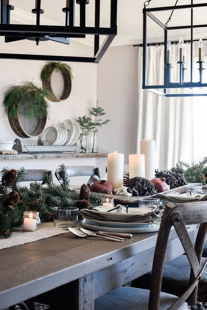 Si tienes una bonita mesa rústica, debes lucirla, para lo cual solo coloca individuales también en algún tejido rústico y natural o de imitación cuero. Deberás dar vida a la mesa con arreglos coloridos estilo navideño o simplemente con ramas, piñas o flores.