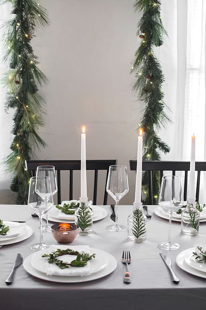 Un frasco pequeño con una ramita adentro sumergida en agua, puede utilizarse como candelabro, lo acompañas con ramas de pino adornadas con luces.