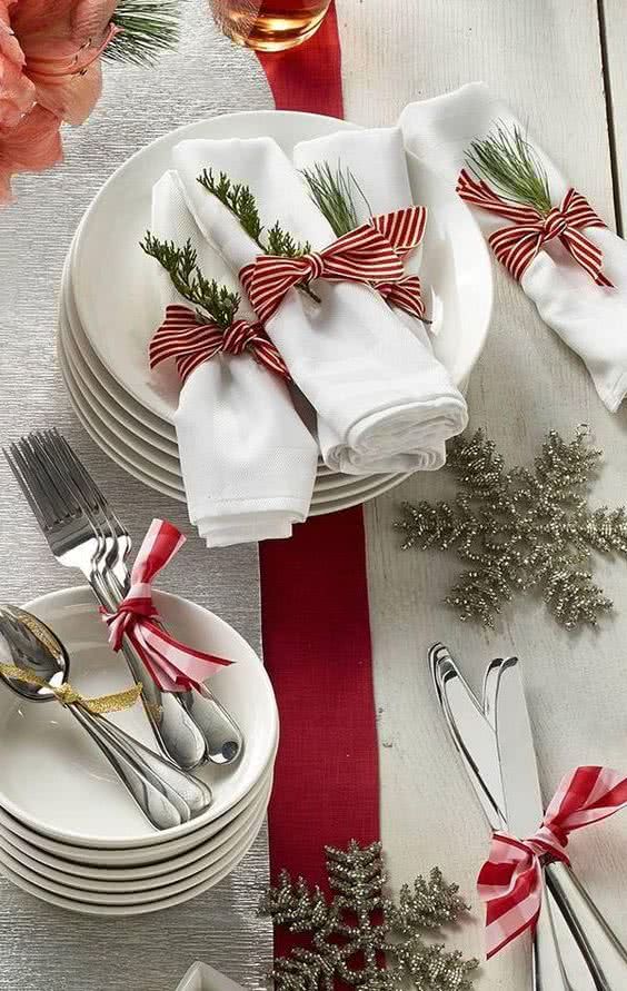La decoración navideña más sencilla que puedes crear es presentando las servilletas con un ramito de hojas perennes, un cordón o cinta y una pequeña tarjeta que indique el lugar de cada comensal en la mesa.