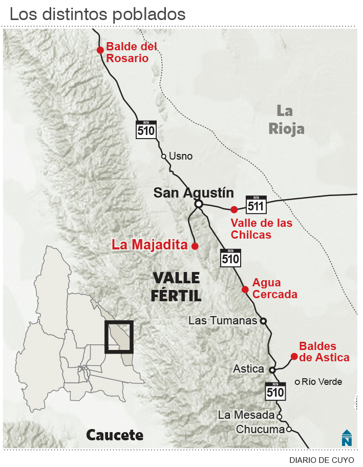 Balde del Rosario, La Majadita, Valle de Las Chilcas, Baldes de Astica o Agua Cercada y otros pueblos de Valle Fértil viven con devoción la Nochebuena y la Navidad. Gozan del reencuentros de vallistos que vuelven a su tierra y disfrutan de la cena con menú local, baile y diversión hasta el amanecer. Lo que no falta es la decoración de las casas y el pesebre, "pero no tanto el Papa Noel", nos aclaran; y un detalle clásico que respetan sin vueltas es la hora del comienzo de la cena del 24: a las 12 de la noche en punto. En ese momento se hace el primer brindis formal entre los familiares y vecinos reunidos, acompañado todo de música. Y aquí aclaran los vecinos que la música llega "sobre todo con temas e intérpretes del lugar, ya que somos muy aferrados a apoyar a nuestros propios cantores, nacidos aquí mismo, como ‘Tres para el canto’, ‘Las Voces de la Calandria’, entre otros grupos folclóricos que se han hecho populares dentro y fuera del departamento. Y por supuesto, llega el momento en que esa música se baila". Quien también nos ha aportado su generosa mirada de hija de esa tierra es la popular periodista Norma Beatriz Ortiz, directora de radio Del Valle, en el 99.5.