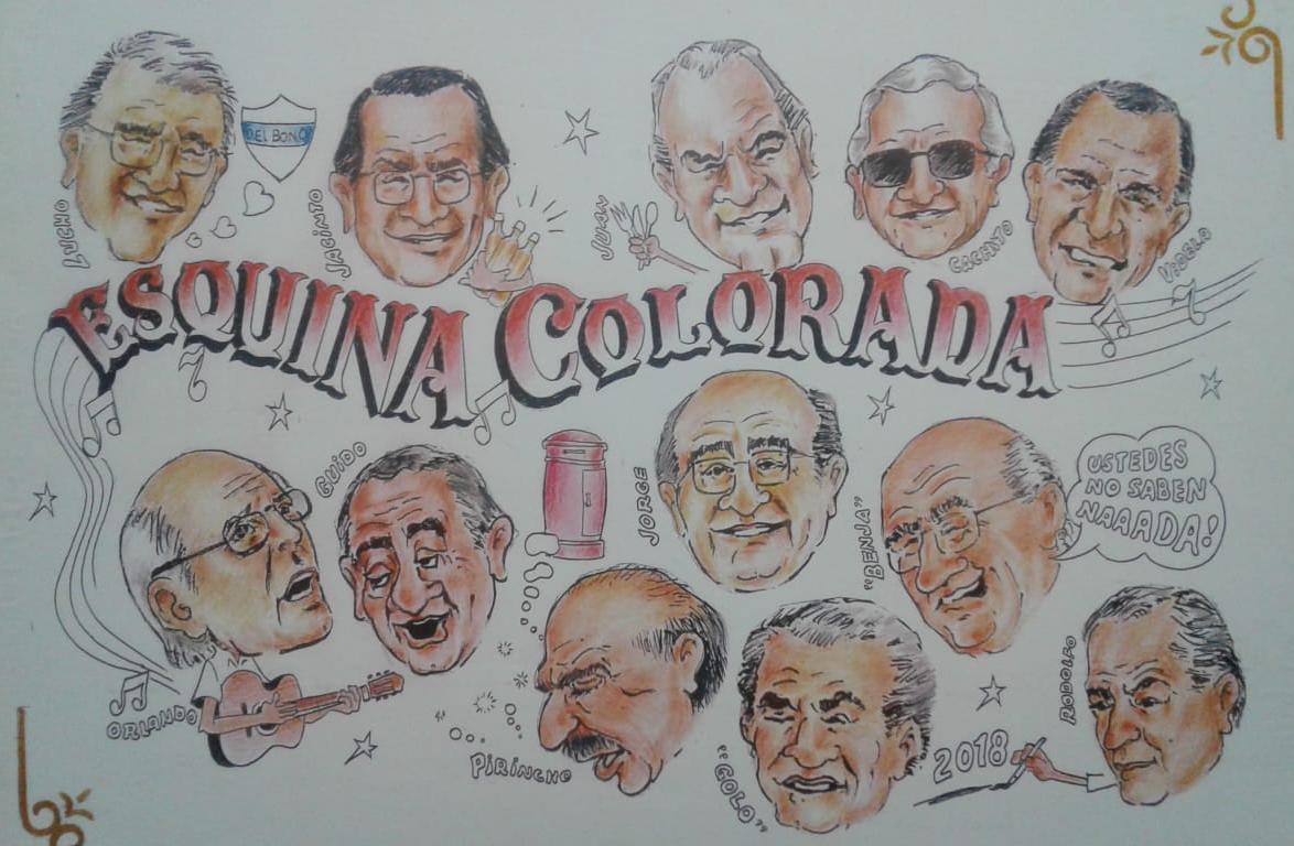 "Esquina Colorada". Mis amigos. Mis hermanos. En este dibujo del inefable Rodolfo Crubellier están parte de los que vamos quedando de aquellos que te habitaron. Y que habitan en mi corazón. Son como una bendición que se descuelga generosa por sobre los hombros de cada uno de nosotros, y que nos prometemos, una vez y otra vez, volver a provocarla, para que se nos venga encima. Como lluvia sanadora.