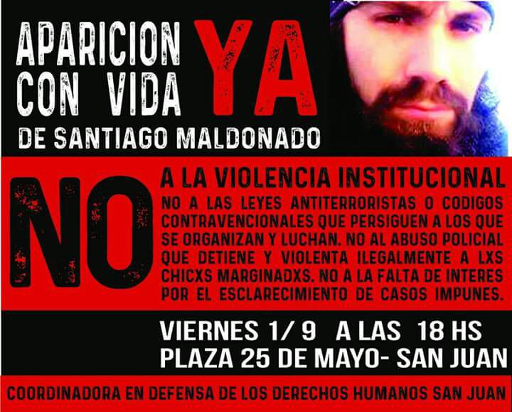 A través de una iniciativa de la Coordinadora en Defensa de los Derechos Humanos de la provincia, este viernes se convocó a una nueva marcha para pedir por la aparición con vida de Santiago Maldonado, el joven que desapareció días atrás en Chubut.