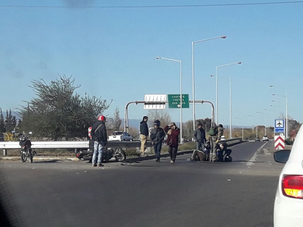 Alrededor de las 15, un auto Volkswagen Pointer impactó con una moto 110 cc, en el Acceso Este metros antes de calle Gorriti, en Santa Lucía. Según testigos del hecho, por el choque, el motociclista quedó tendido en el suelo y la rueda delantera destrozada.