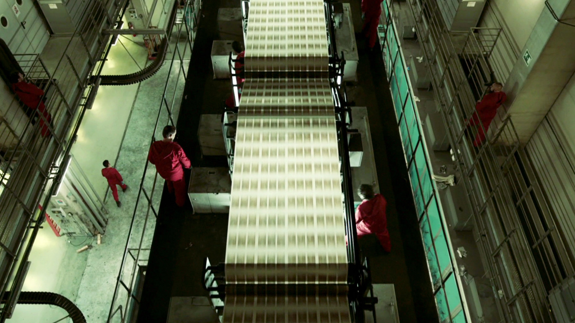 El interior de la Casa de la Moneda fue recreado por la producción, aunque más parecido al Museo de Ciencias de París. Y los millones de euros, ¿adónde se imprimieron? En las rotativas del periódico ABC, y en papel de diario, justamente.