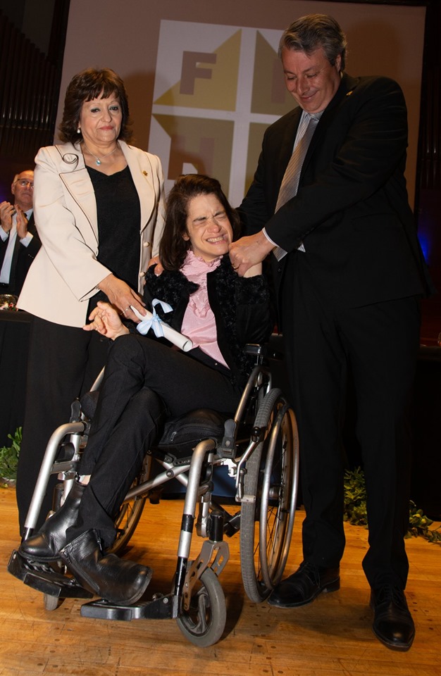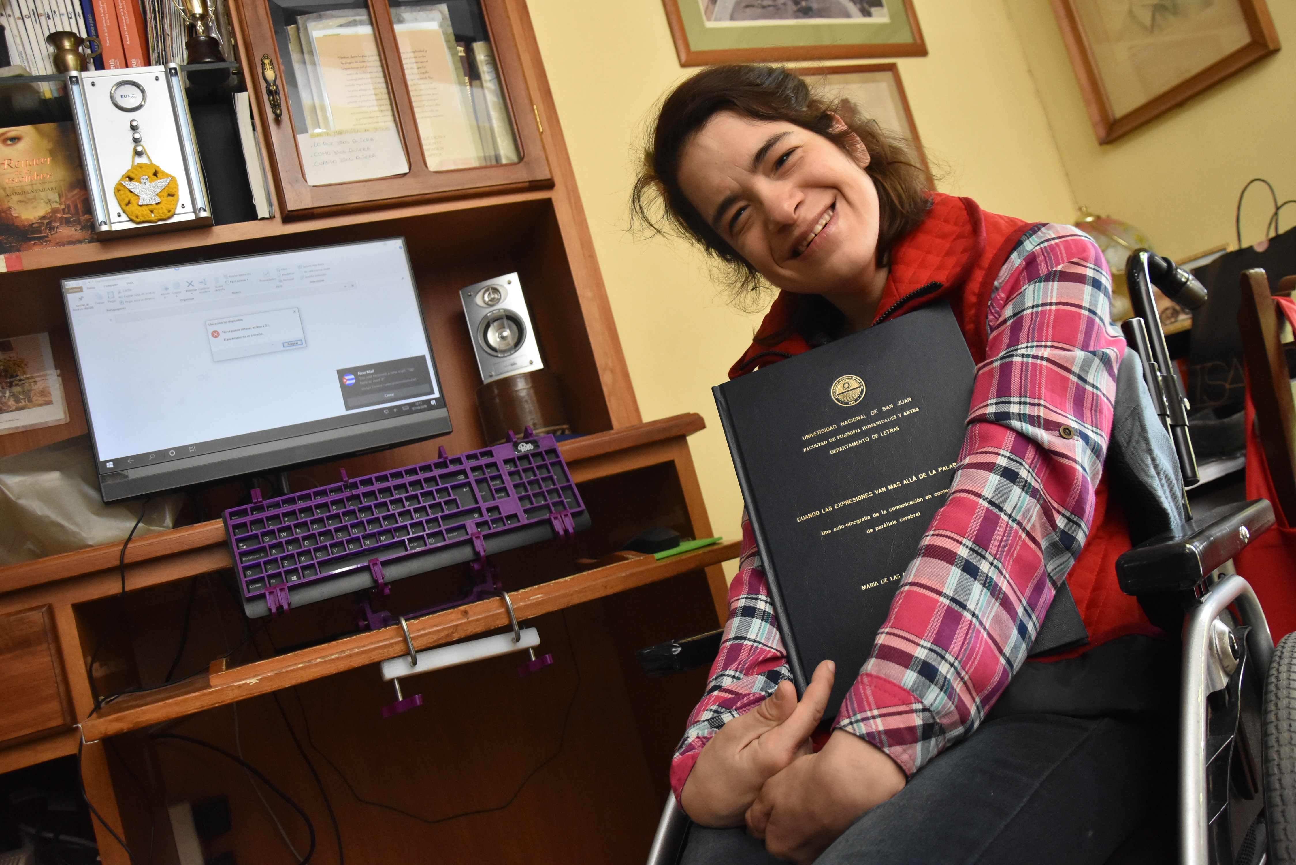 Un logro. Poro abrazada a su trabajo de tesis en el que deja testimonio de su proceso personal para comunicarse, superando muchos de los obstáculos de una parálisis cerebral severa.