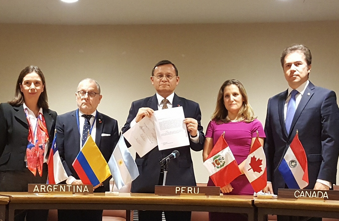 Los cancilleres de Argentina, Chile, Colombia, Paraguay, Perú y Canadá presentaron en los márgenes de la Asamblea General de la Organización de las Naciones Unidas (ONU) una carta sellada el martes pasado por los líderes de sus respectivos países solicitando la intervención de la Corte con sede en La Haya, Holanda.