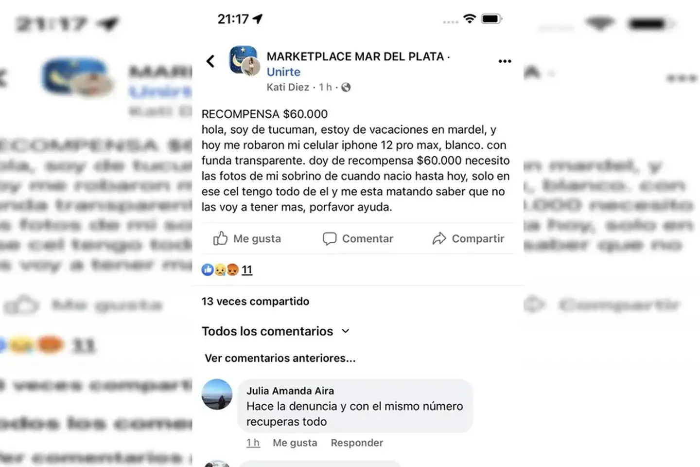 “Hola, soy de Tucumán. Estoy de vacaciones en Mardel y hoy me robaron un celular iPhone 12 Pro Max, blanco con funda transparente. Doy como recompensa $60 mil pesos. Necesito las fotos de mi sobrino, desde que nació hasta hoy. Solo en ese celular tengo todo de él y me está matando saber que no las voy a tener más. Por favor, ayuda”, pidió la joven en su posteo en la red social.