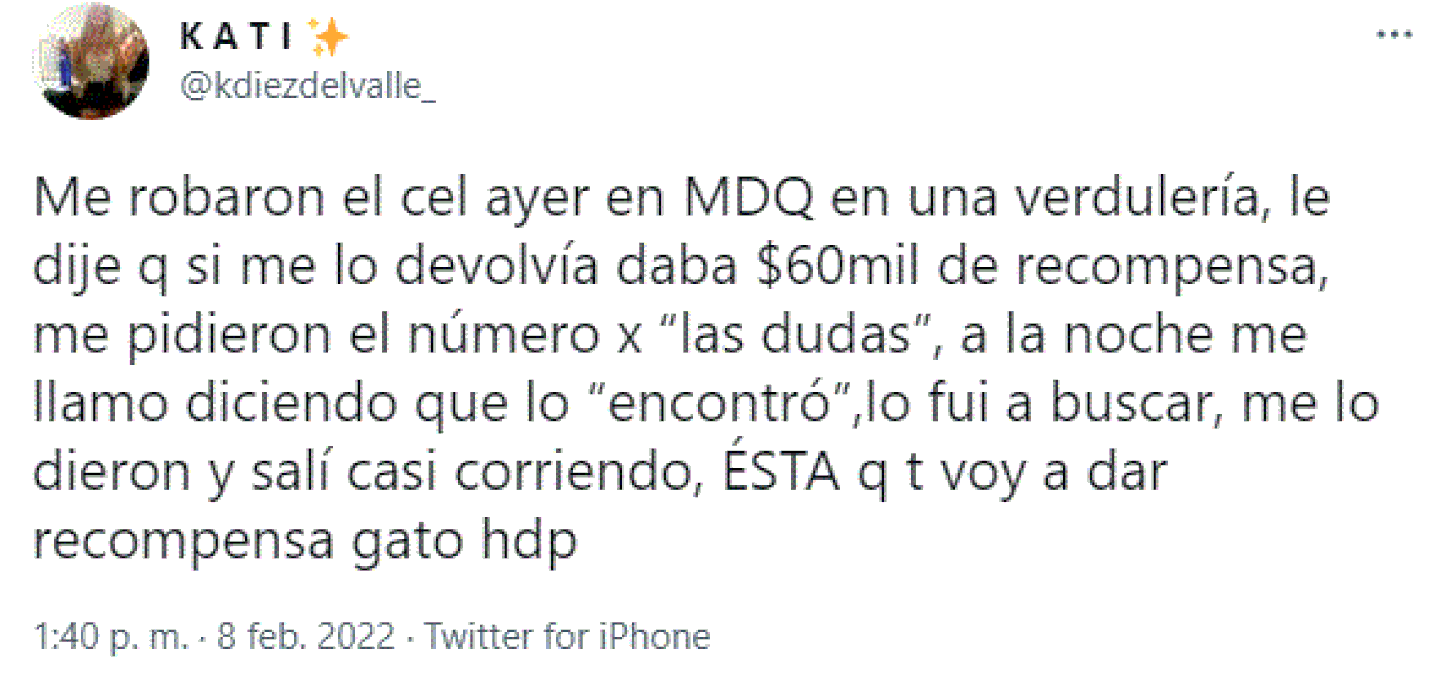 “Me robaron el celular ayer en Mar del Plata en una verdulería. Dije que si me lo devolvía daba $60 mil de recompensa. Me pidieron el número por ‘las dudas’. A la noche me llamaron diciendo que ‘lo encontró’. Lo fui a buscar, me lo dieron y salí casi corriendo. Esta que te voy a dar recompensa”, escribió Kati en su perfil de Twitter @kdiezdelvalle_.