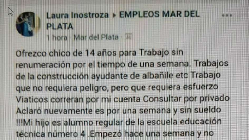 Laura Inostroza escribió: “Ofrezco chico de 14 años para trabajo sin remuneración por el tiempo de una semana”. Pero fue específica con el área laboral: “Trabajos de la construcción, ayudante de albañil, etc. Un trabajo que no requiera peligro, pero que requiera esfuerzo. Los viáticos correrán por mi cuenta”.