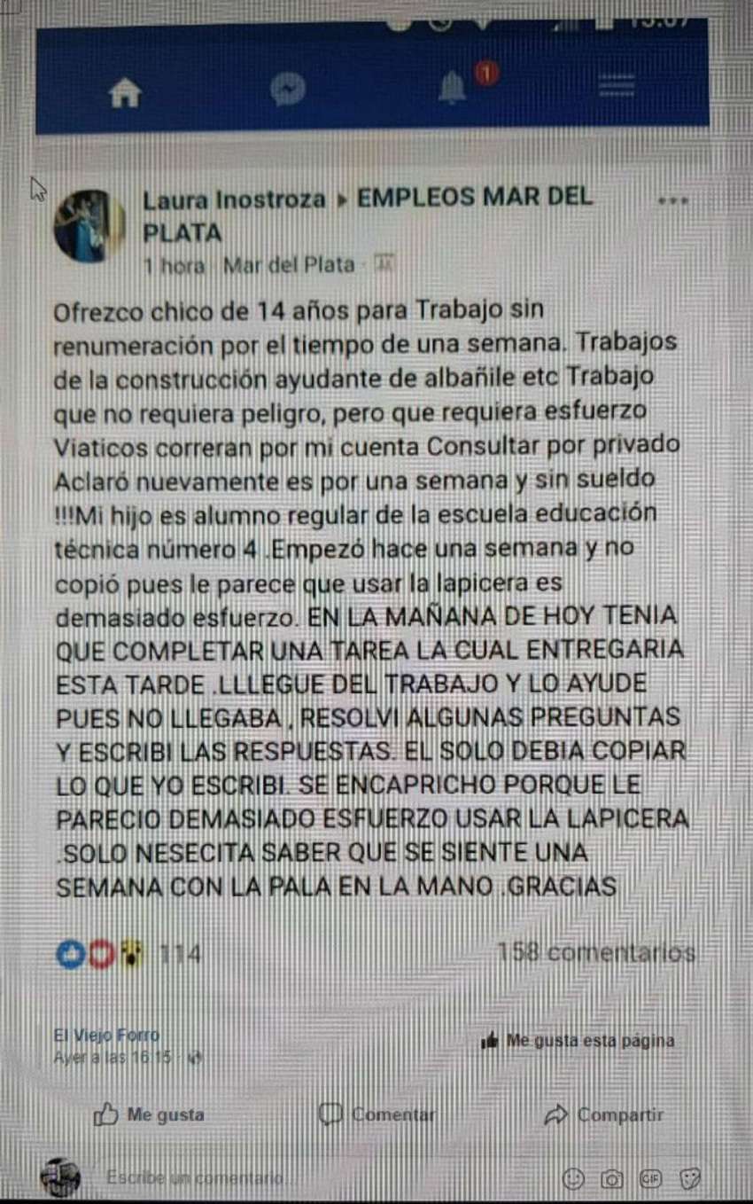 Una mamá de Mar del Plata ofreció en un grupo de búsqueda laboral de Facebook a su hijo de 14 años para que trabaje y así darle una lección, ya que el joven no quería “agarrar la lapicera” y hacer la tarea.