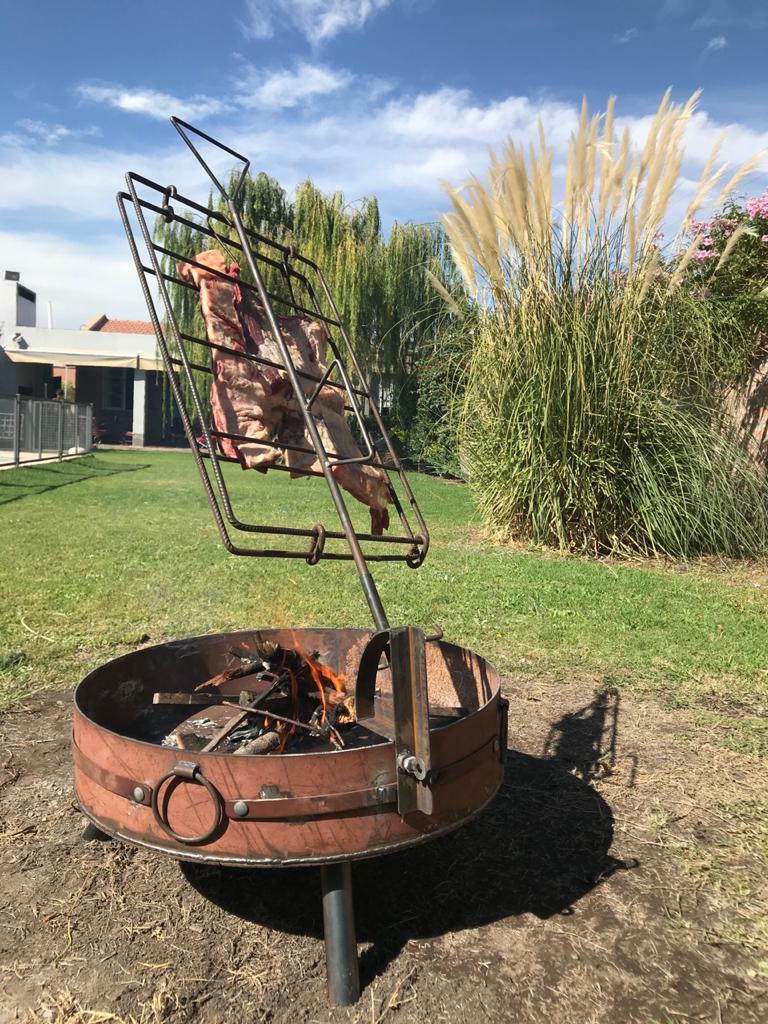 Un fogonero amplio, donde poder cocinar y lucirse con la familia y los amigos, es ideal. Se puede transportar donde quieras, galería, terraza, patio o jardín y, puede estar sobre el césped o cerámico. El disfrute es grande ya que en simultáneo puedes asar una carne y verduras o achuras a otra plancha.