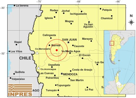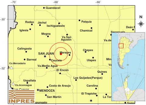 Fue a las 15:58:13 de hoy y tuvo como epicentro 68 km al Suroeste de San Juan; 115 km al Norte de Mendoza; 42 km al SE de Barreal. Tuvo una Magnitud de 3,8° en la Escala de Richter. Fue a una profunidad de 120 km. Fue de Intensidad II a III en la Escala Mercalli Modificada, informó el Inpres.