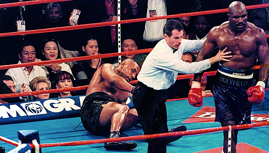 El 9 de noviembre de 1996, en el MGM Grand Garden Arena de Las Vegas, el mundo vio como el reinado de Tyson en los pesos pesados llegaba a su final. Una clínica de boxeo de Hollyfield derivó en su nocaut en el 11mo round para quedarse con el cetro de la AMB. Por ese combate se recaudaron unos 100 millones de dólares y los ingresos por Pay Per View ascendieron a 80, teniendo un total de suscriptores para observar el combate de 1,6 millones.