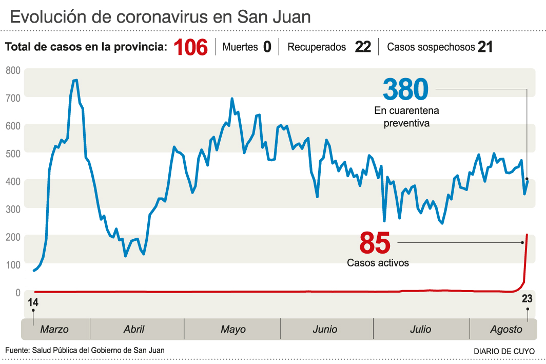 A través de la División Epidemiología y de la División Bioquímica se informó que hasta las 19 del día de ayer, se confirmaron 21 nuevos casos positivos de Covid-19, de contactos estrechos de los casos de Caucete y Santa Lucía. Si bien fueron menos que los 33 confirmados el sábado pasado, lograron que el total superara los 100.