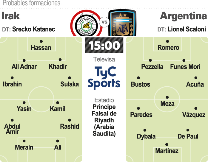 Sergio Romero y Nicolás Otamendi son los emblemas de este equipo, que también cuenta con los delanteros Paulo Dybala, Mauro Icardi y Lautaro Martínez. Irak espera que se repita lo que pasó el 22 de febrero de 1989, cuando el equipo Sub-20 dio el batacazo y venció al de Argentina por 1-0 en el Mundial juvenil que se disputó, justamente, en Arabia Saudí. En ese equipo juvenil argentino se destacaban, entre otros, Diego "Cholo" Simeone, Antonio Mohamed y Roberto Bonano. Ante la Albiceleste debutará como entrenador del seleccionado iraquí el esloveno Srecko Katanec. En el equipo asiático se destaca el delantero nacido en Estados Unidos pero nacionalizado iraquí Justin Meram, de 29 años, quien juega en el Columbus Crew de su país natal.