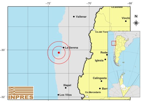 El epicentro se ubicó a 23 km al SO de Coquimbo y tuvo una profundidad de 20 kilómetros.