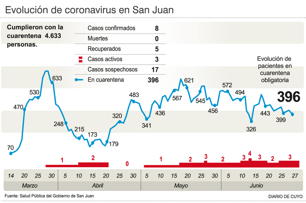 A su vez, hay 17 casos sospechosos que están pendientes del resultado que arroje el análisis que lleva a cabo el laboratorio de Virología del hospital Rawson, en tanto que 155 test dieron negativo.