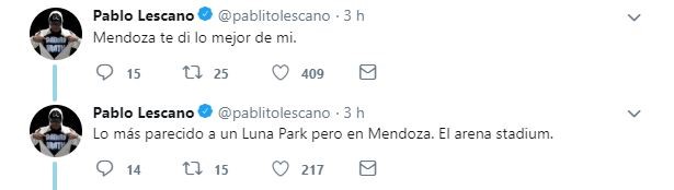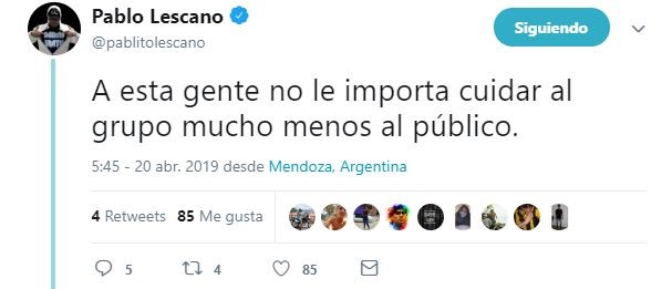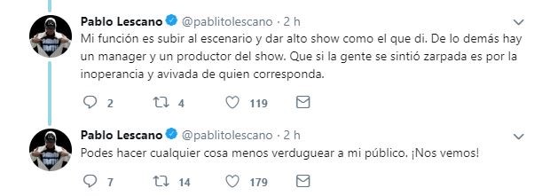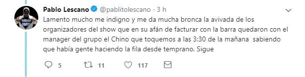 Pero luego Pablo aprovechó para pedir disculpa a sus fans: “Lamento mucho, me indigno y me da mucha bronca la avivada de los organizadores del show que en su afán de facturar con la barra quedaron con el manager del grupo el Chino que toquemos a las 3:30 de la mañana sabiendo que había gente haciendo la fila desde temprano”, escribió Lescano.